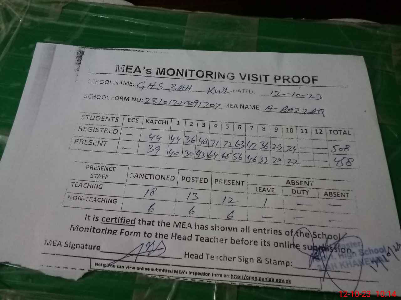 | Certified that this School was Inspected by the Undersigned MEA/DMO Today and the Information Stated Above is as Per Record. | |||||
