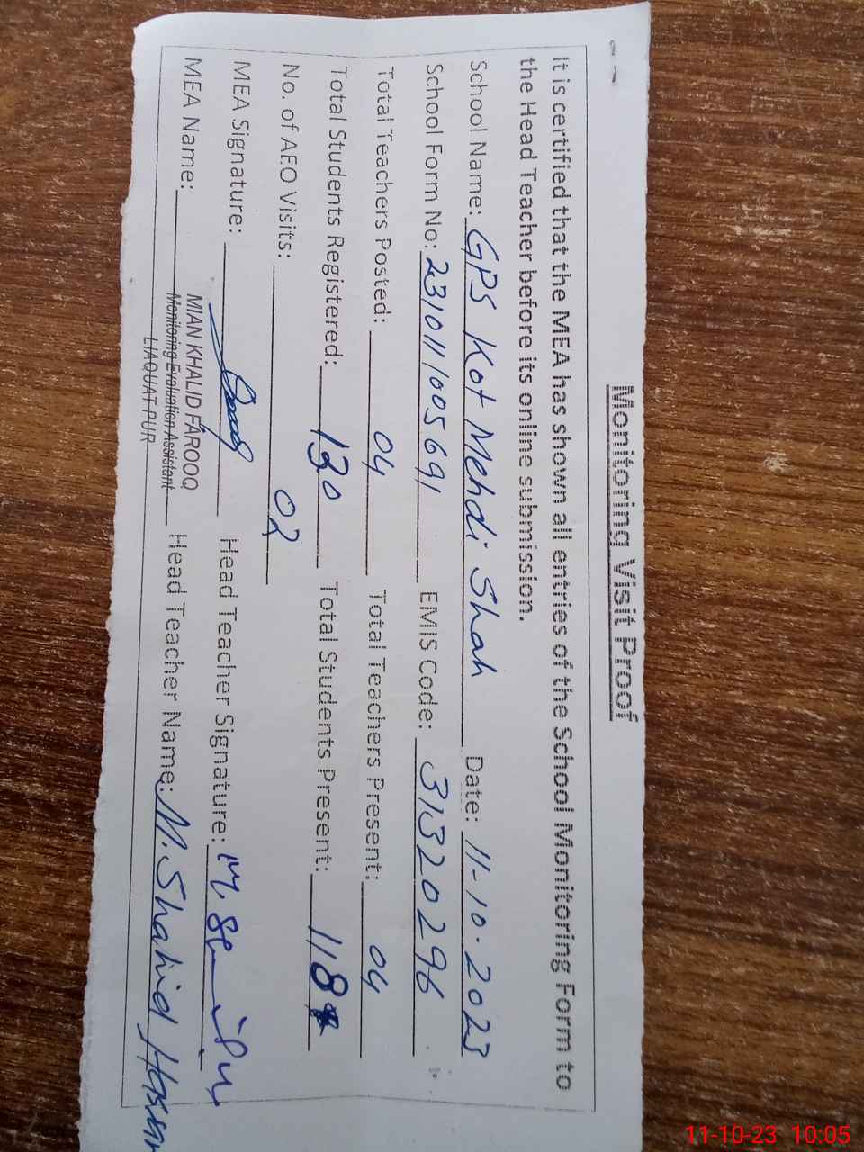 | EMIS Code: 31320296 | Name of School: GPS KOT MEHDI SHAH | |||