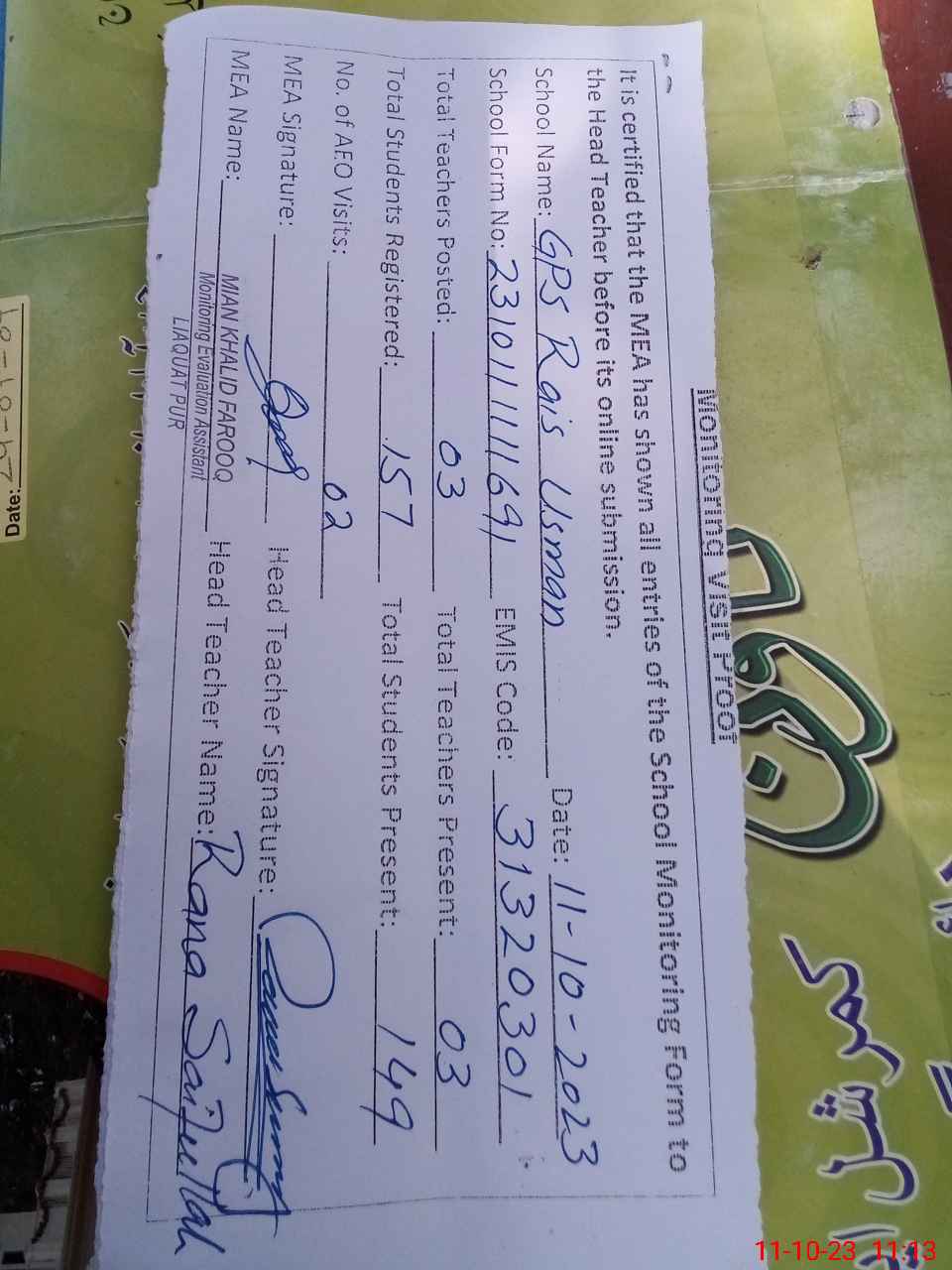 | EMIS Code: 31320301 | Name of School: GPS RAEES USMAN | |||