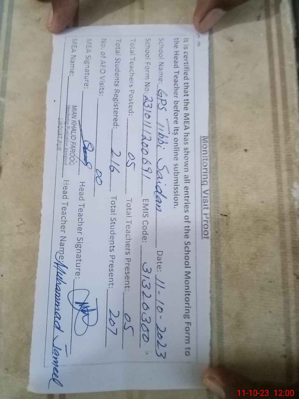 | Attendance Register | Head Teacher | MEA with School | Visit Proof |