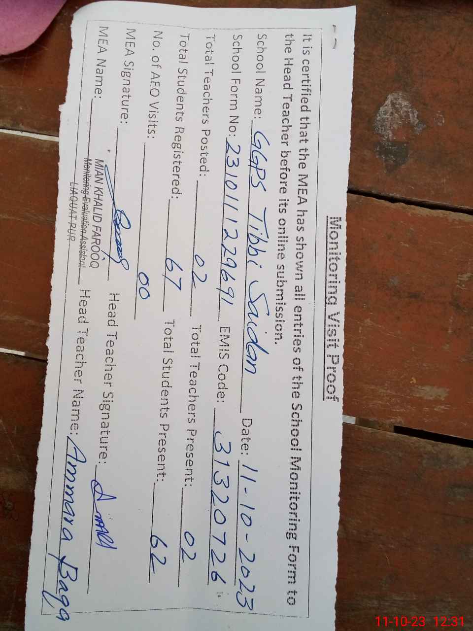 | Monitoring Date: 11-10-2023 | Start Time: 11-10-2023 12:09 PM | End Time: 11-10-2023 12:36 PM | Name of MEA: Kh**** Fa**** | |