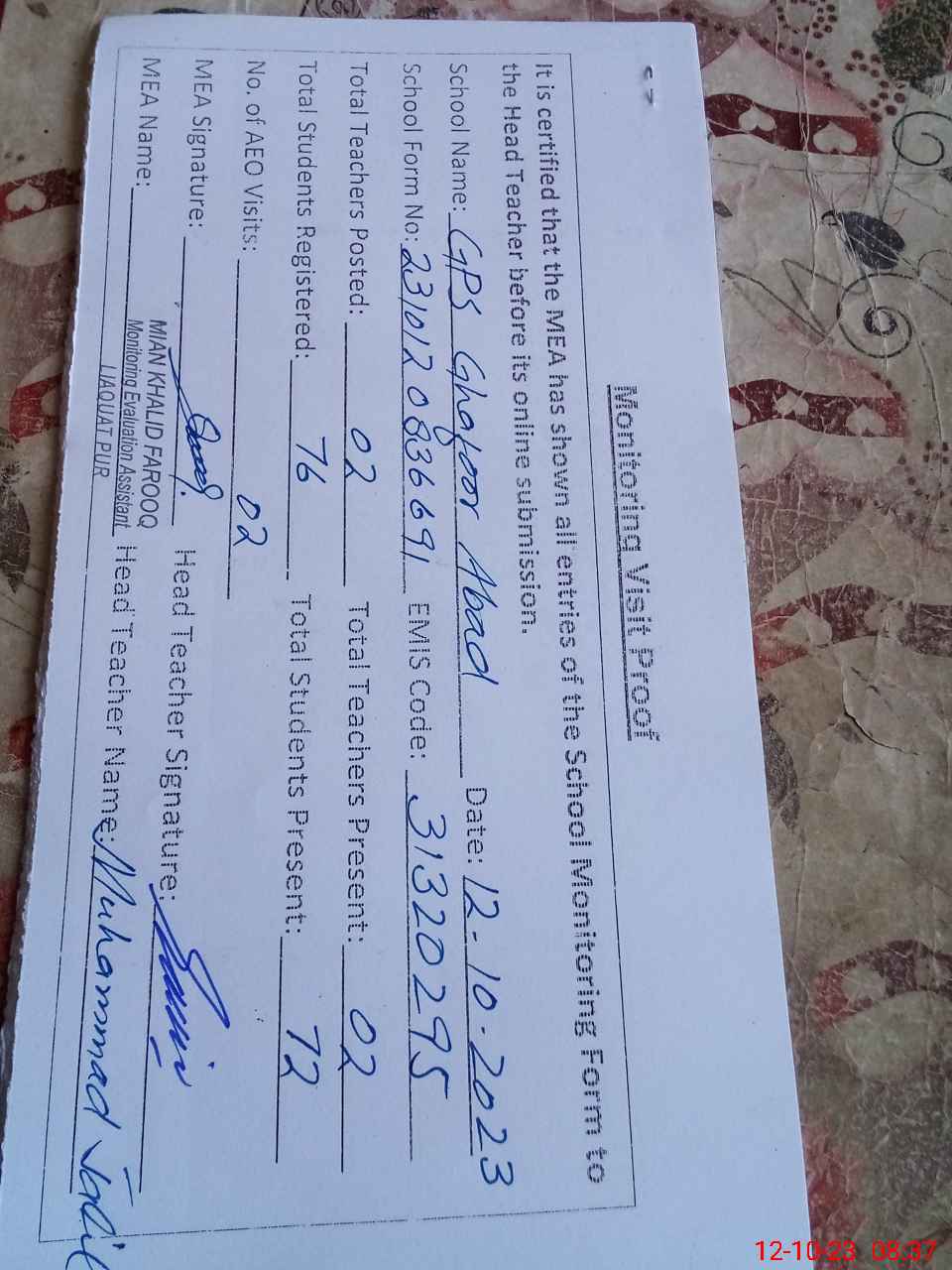 | Attendance Register | Head Teacher | MEA with School | Visit Proof |