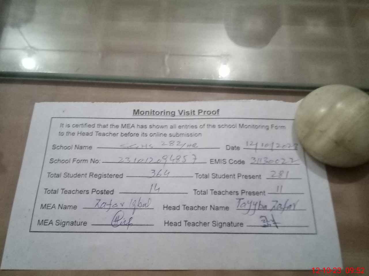 | Monitoring Date: 12-10-2023 | Start Time: 12-10-2023 09:22 AM | End Time: 12-10-2023 09:53 AM | Name of MEA: Za**** Iq**** BN**** | |
