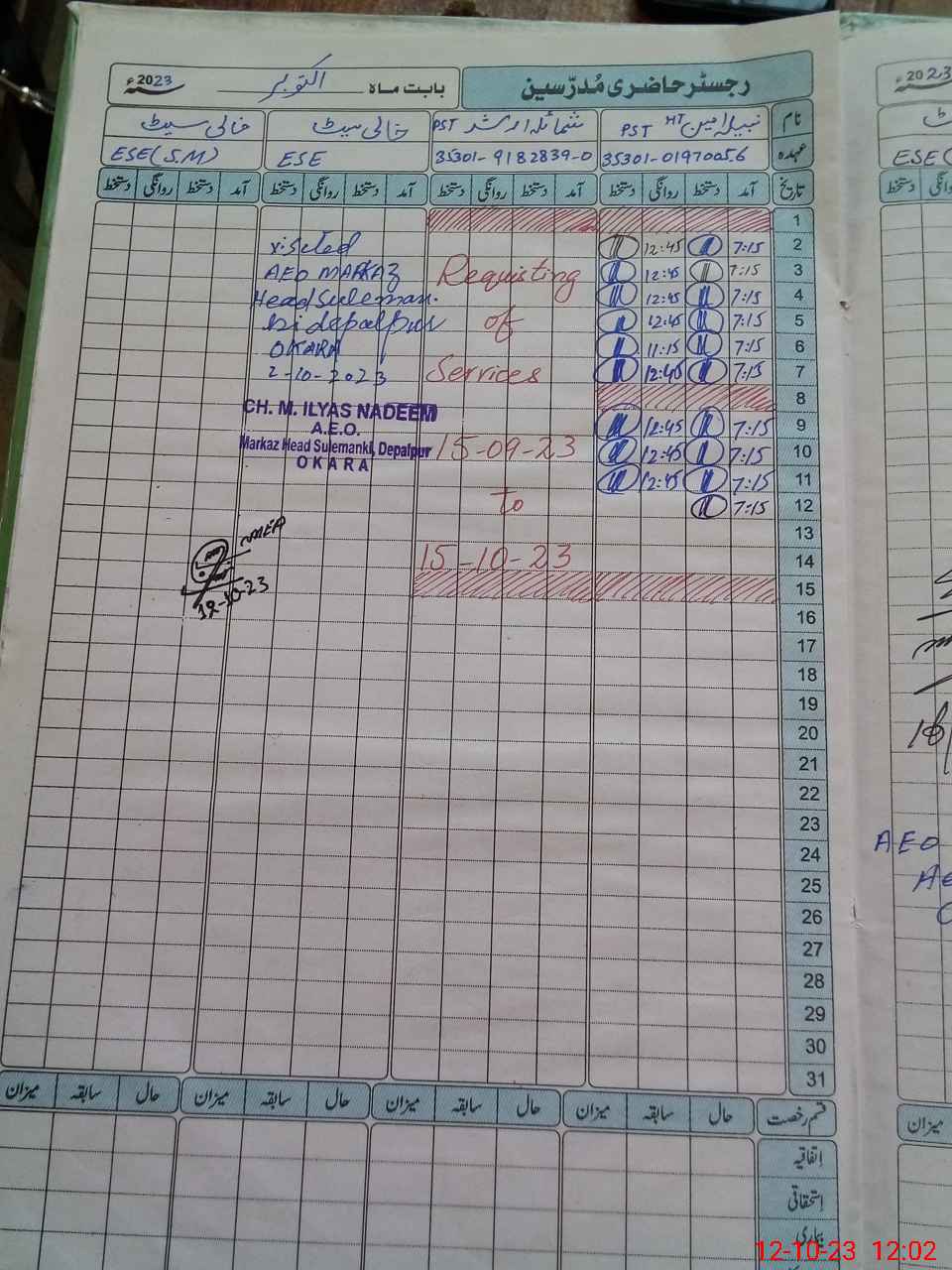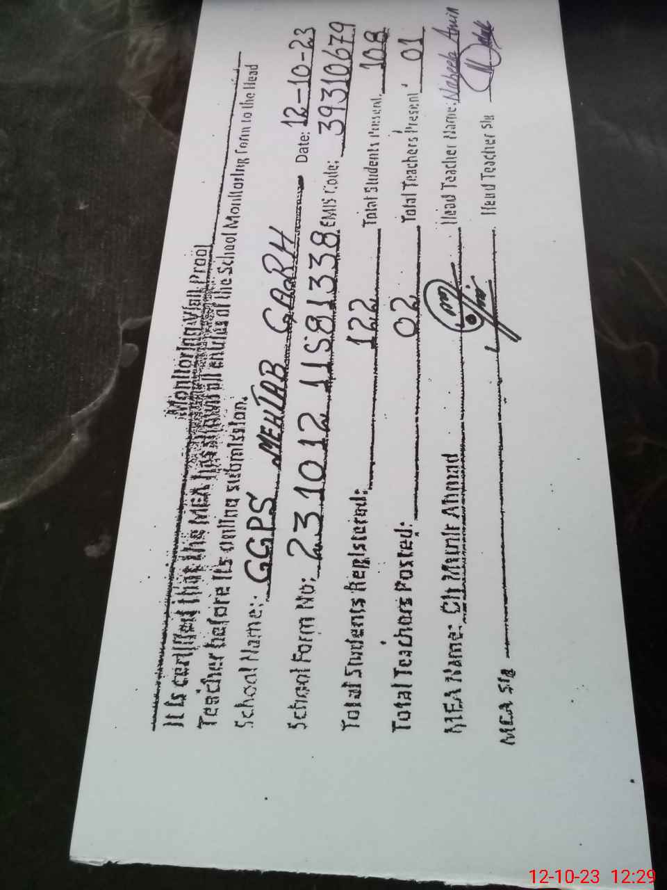 | Name: NA**** AM**** Designation: (School Headmaster's/Headmistress's) PST Phone/Cell Number: 03**** |