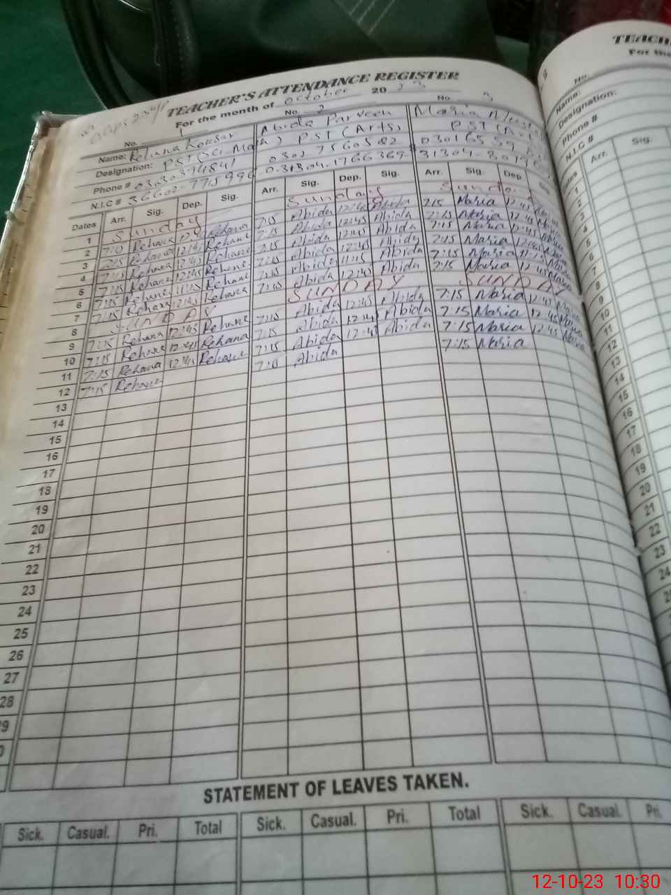 | CNIC | Full Name | Designation | R/C | Absence During Last Calender Month |
