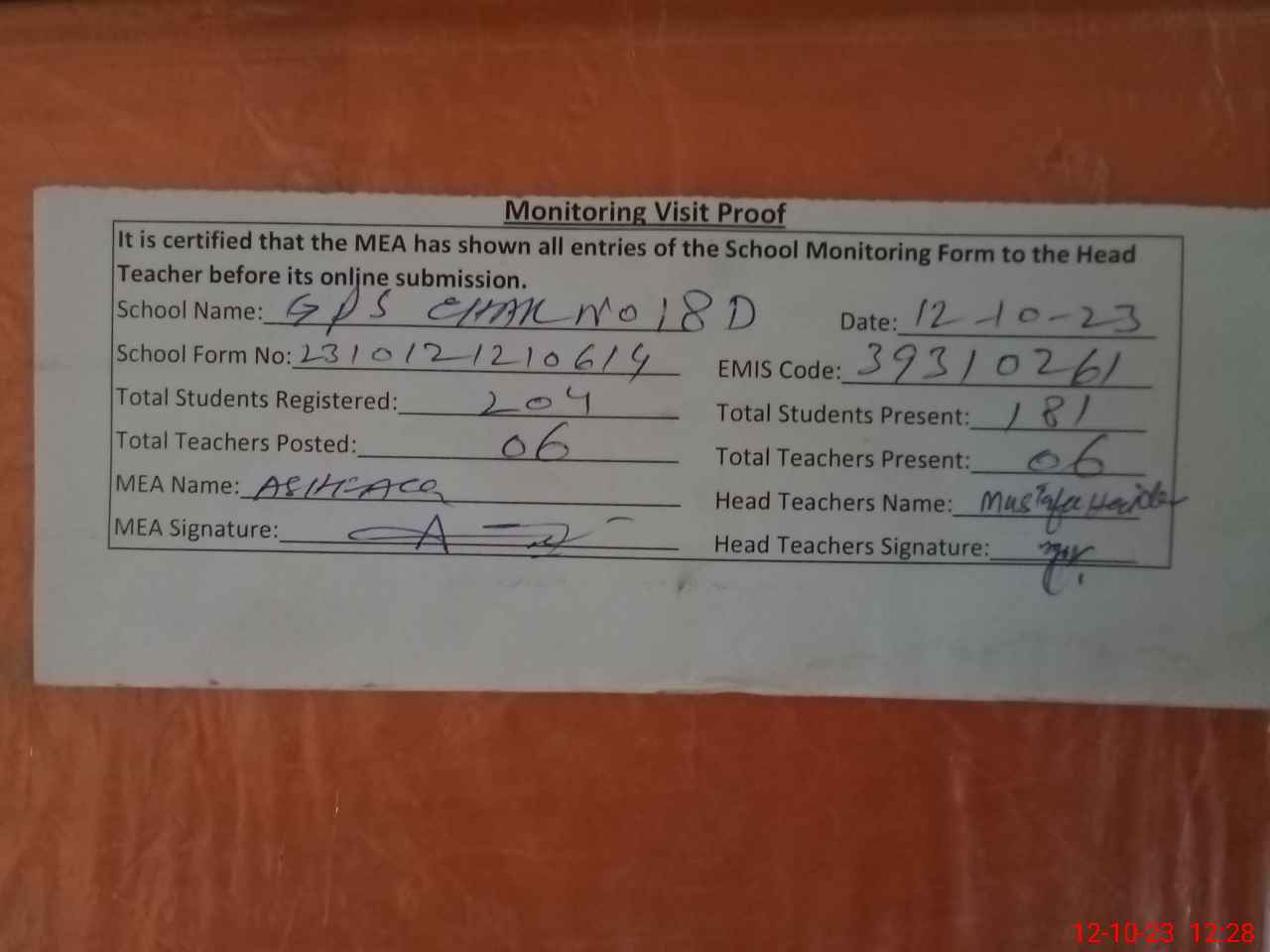 | Attendance Register | Head Teacher | MEA with School | Visit Proof |