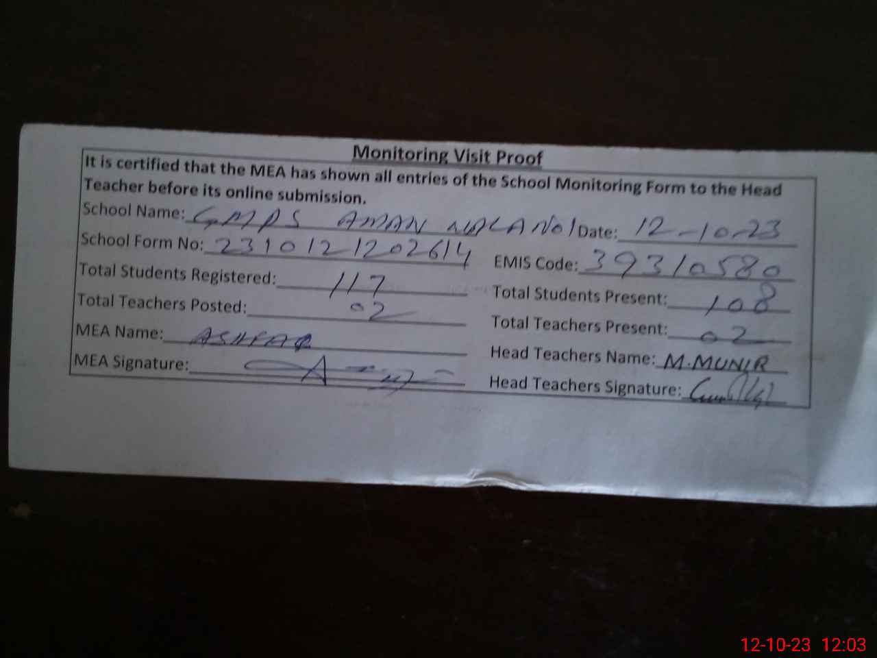 | EMIS Code: 39310580 | Name of School: GMPS AMAN WALA NO. 1 | |||