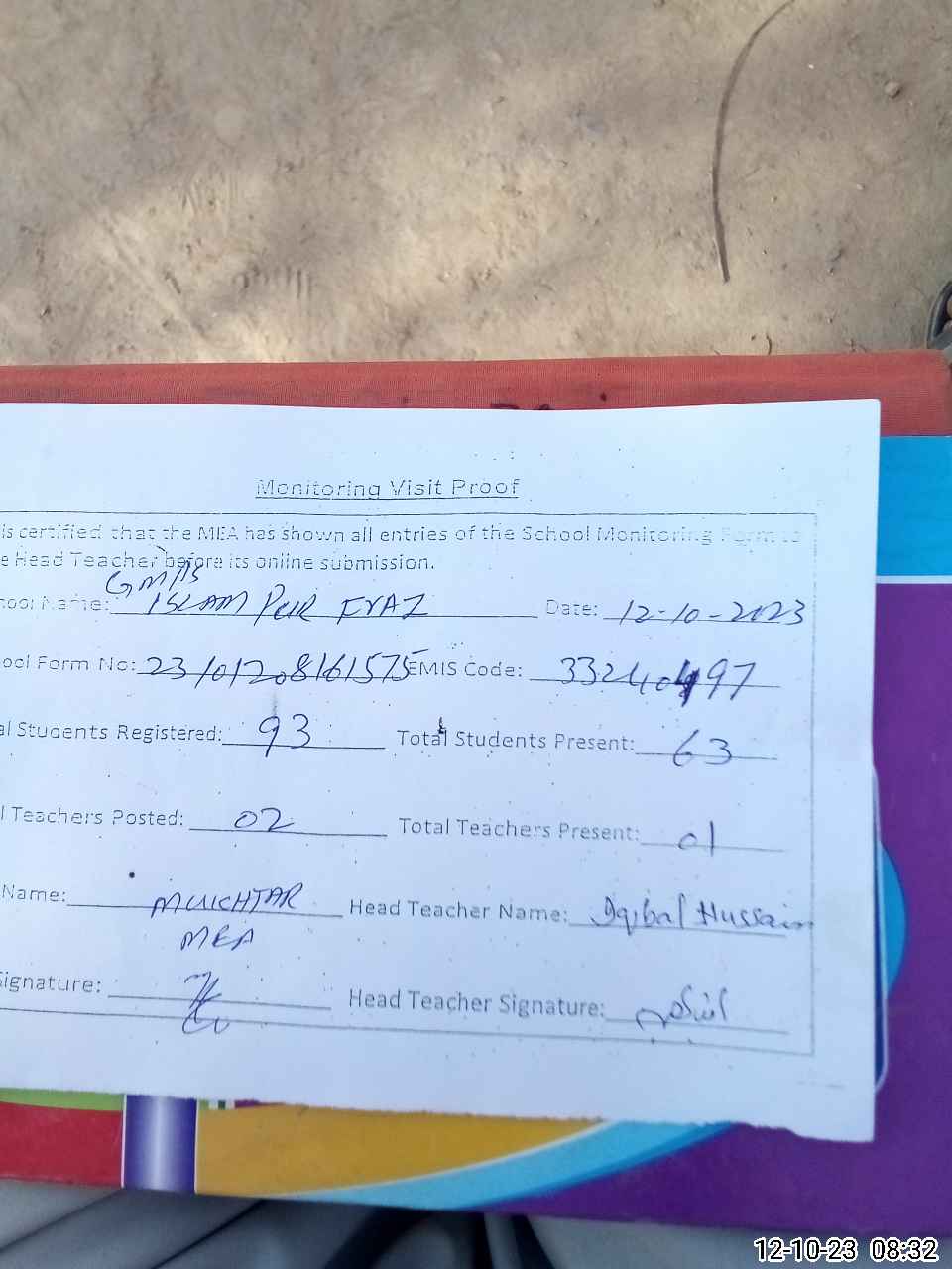 | Attendance Register | Head Teacher | MEA with School | Visit Proof |