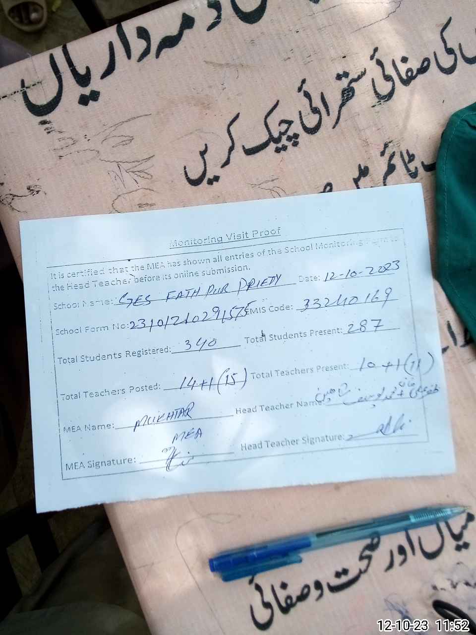| EMIS Code: 33240169 | Name of School: GES FATEH PUR PARITY | |||