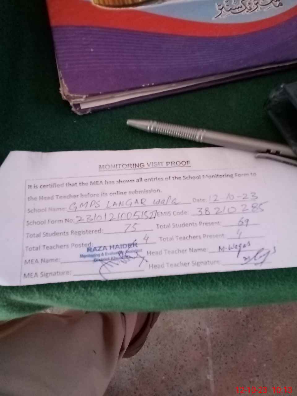 | EMIS Code: 38210285 | Name of School: GMPS LANGAR WALA | |||