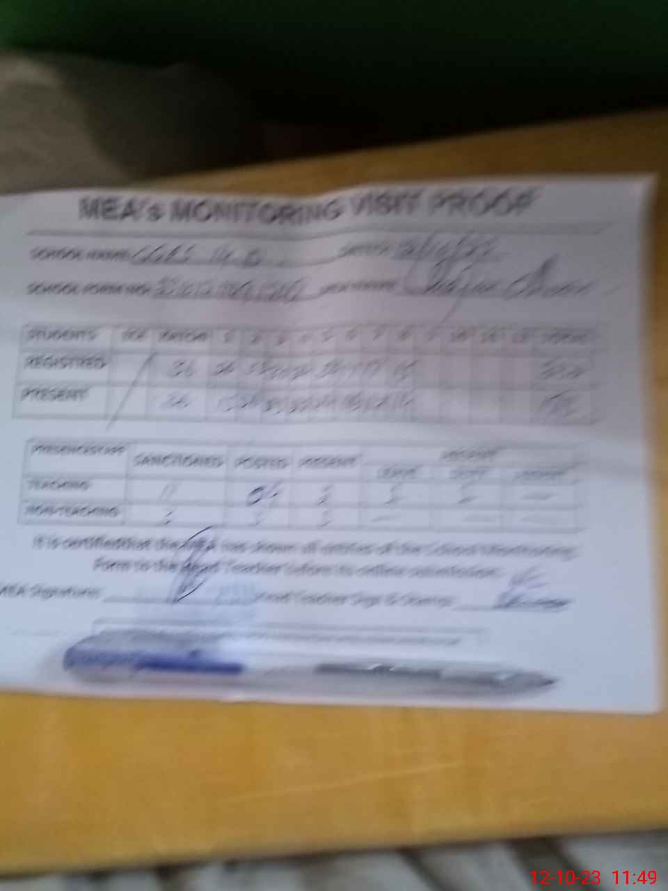 | Attendance Register | Head Teacher | MEA with School | Visit Proof |