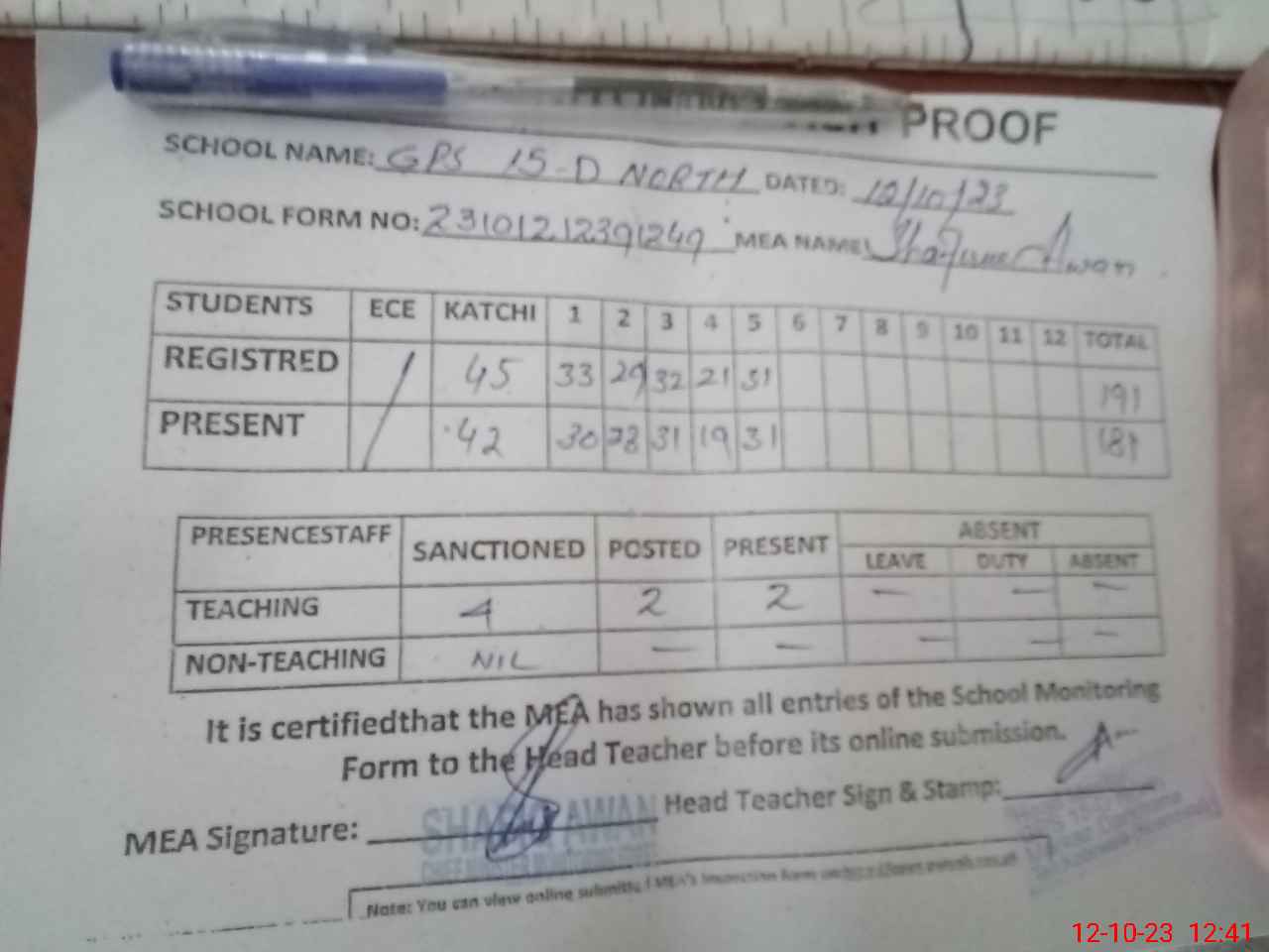 | Attendance Register | Head Teacher | MEA with School | Visit Proof |