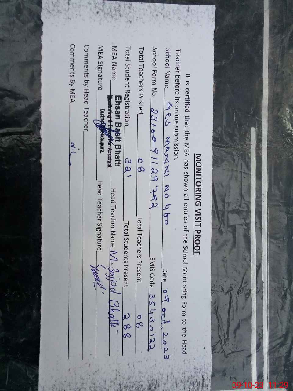 | Attendance Register | Head Teacher | MEA with School | Visit Proof |
