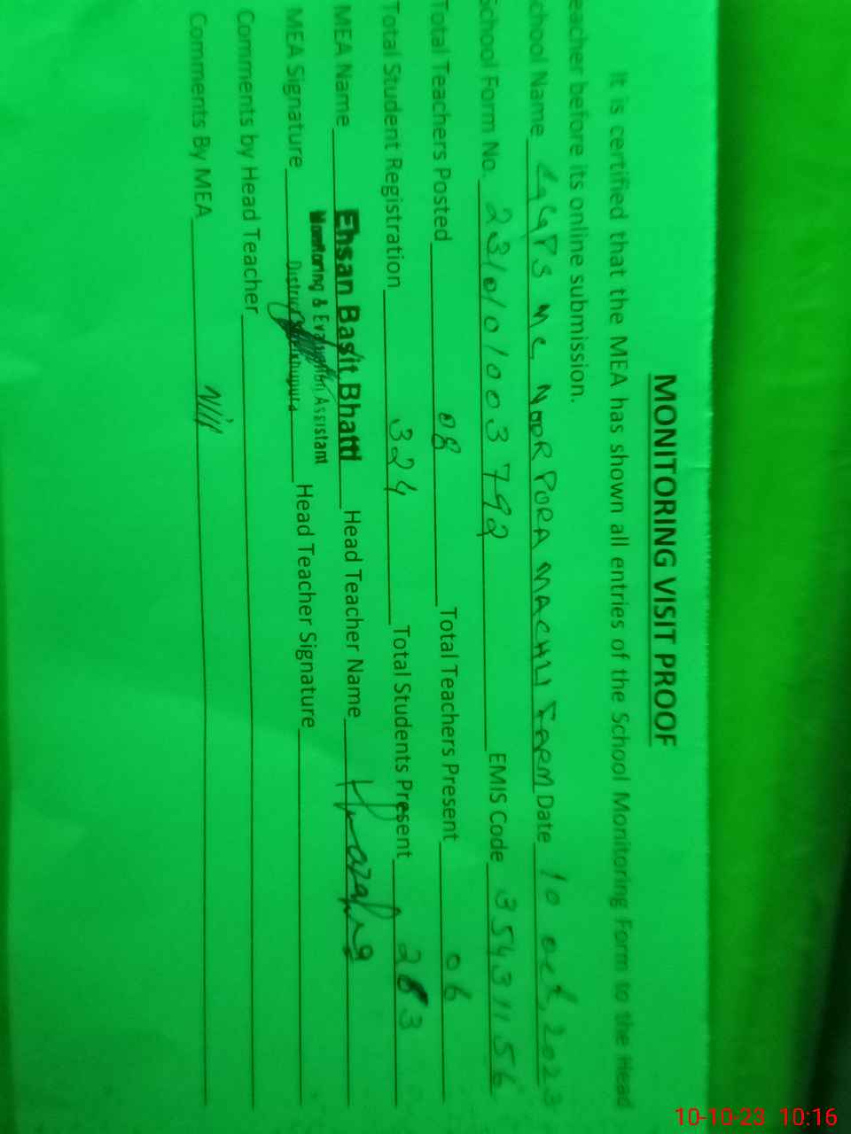 | Monitoring Date: 10-10-2023 | Start Time: 10-10-2023 09:25 AM | End Time: 10-10-2023 10:16 AM | Name of MEA: Eh**** Ba**** Bh**** | |