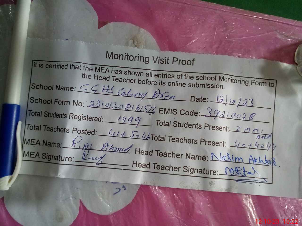 | Attendance Register | Head Teacher | MEA with School | Visit Proof |