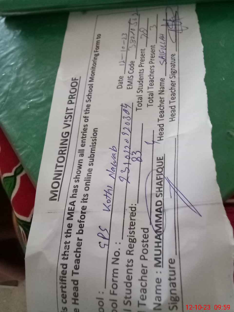 | Attendance Register | Head Teacher | MEA with School | Visit Proof |