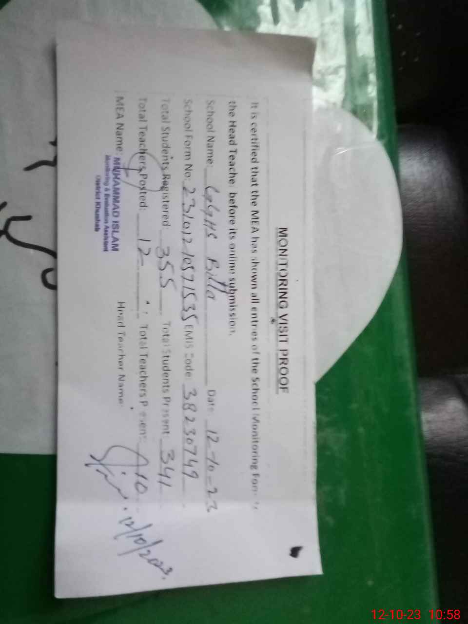 | Attendance Register | Head Teacher | MEA with School | Visit Proof |