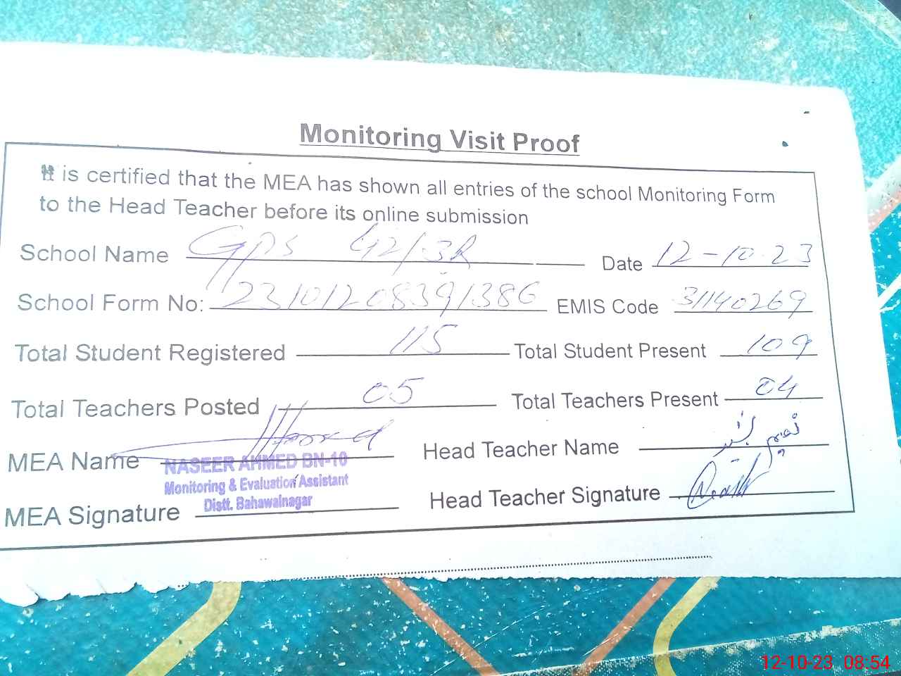 | Attendance Register | Head Teacher | MEA with School | Visit Proof |