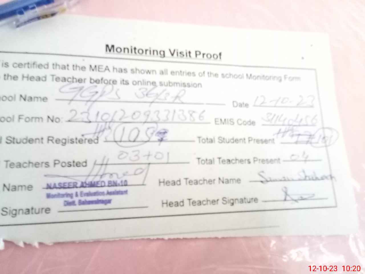 | Attendance Register | Head Teacher | MEA with School | Visit Proof |