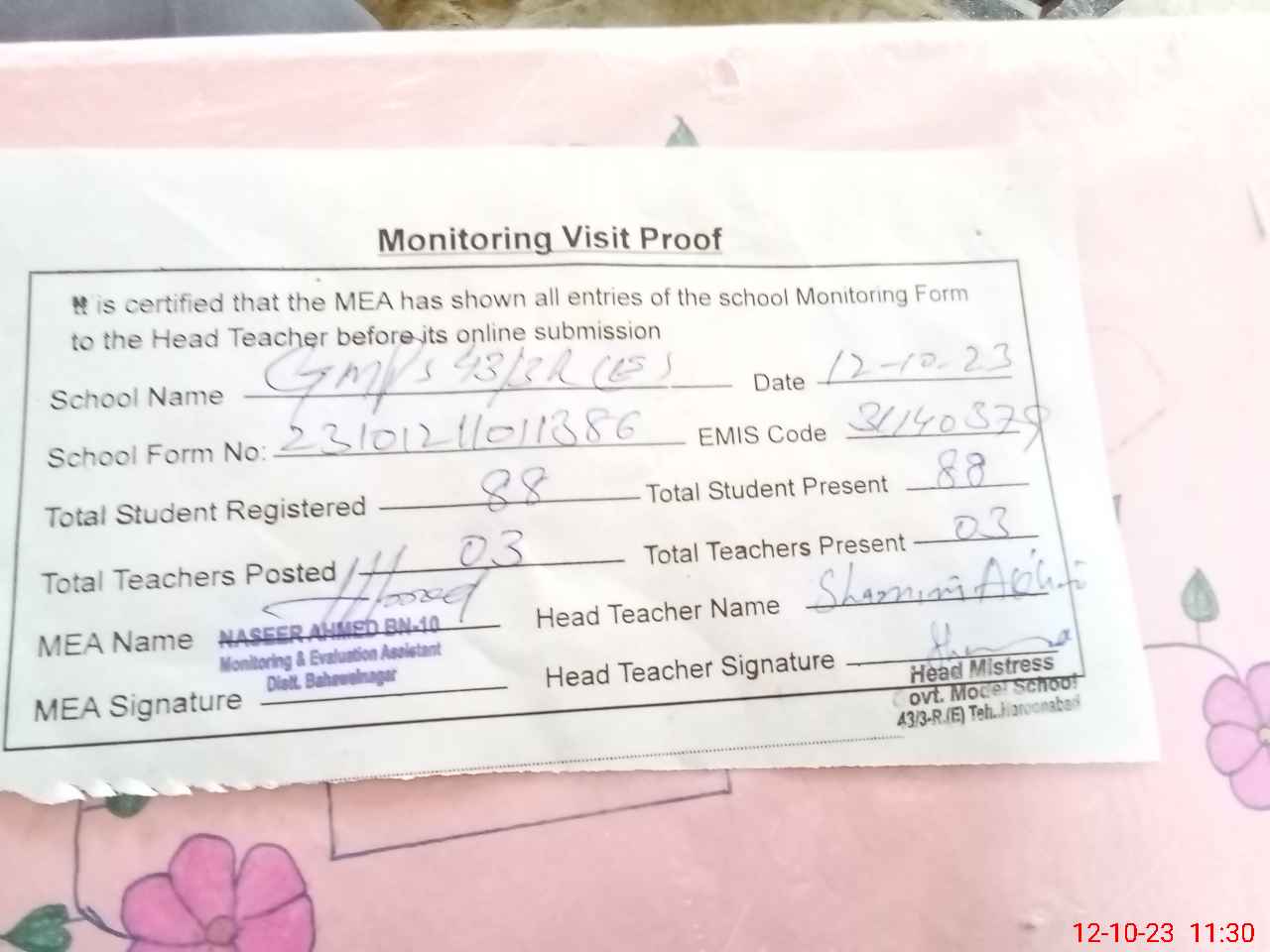 | Certified that this School was Inspected by the Undersigned MEA/DMO Today and the Information Stated Above is as Per Record. | |||||