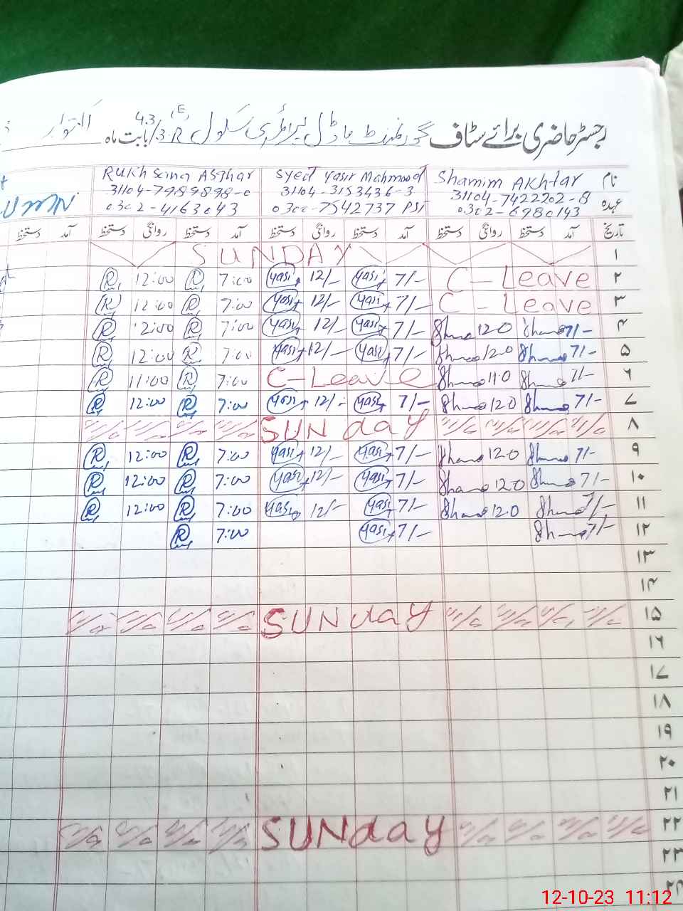 | CNIC | Full Name | Designation | R/C | Absence During Last Calender Month |