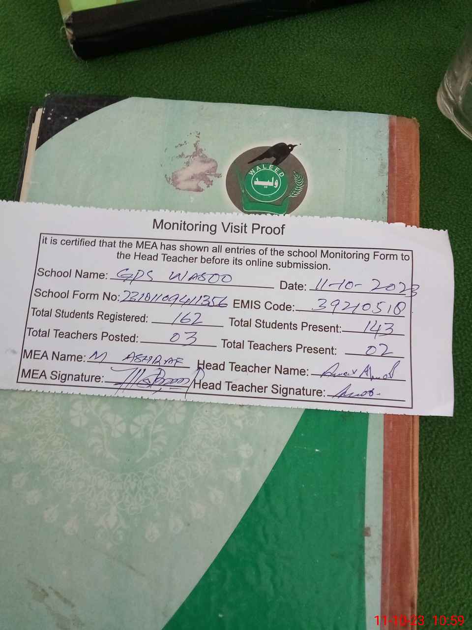 | Attendance Register | Head Teacher | MEA with School | Visit Proof |