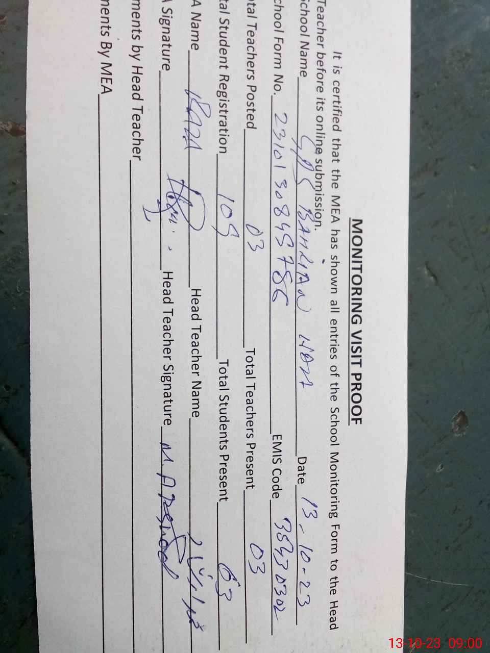 | Attendance Register | Head Teacher | MEA with School | Visit Proof |