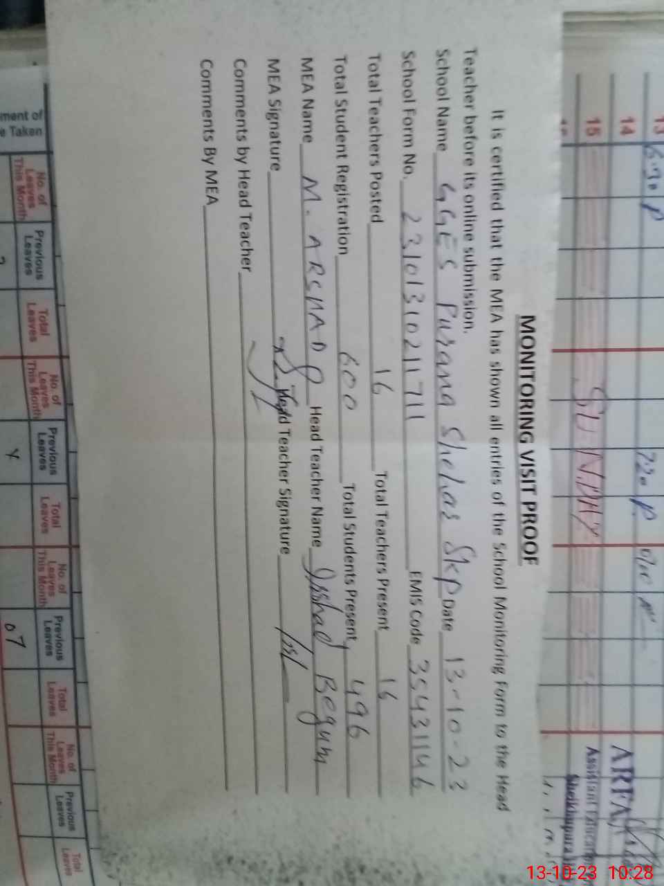 | Monitoring Date: 13-10-2023 | Start Time: 13-10-2023 09:01 AM | End Time: 13-10-2023 10:29 AM | Name of MEA: Mu**** Ar**** | |