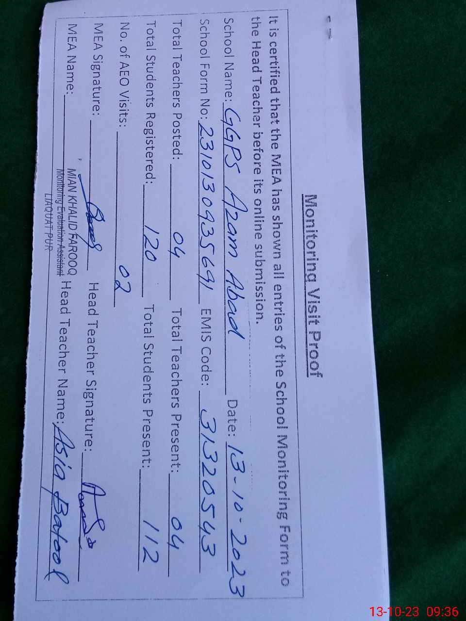 | Attendance Register | Head Teacher | MEA with School | Visit Proof |