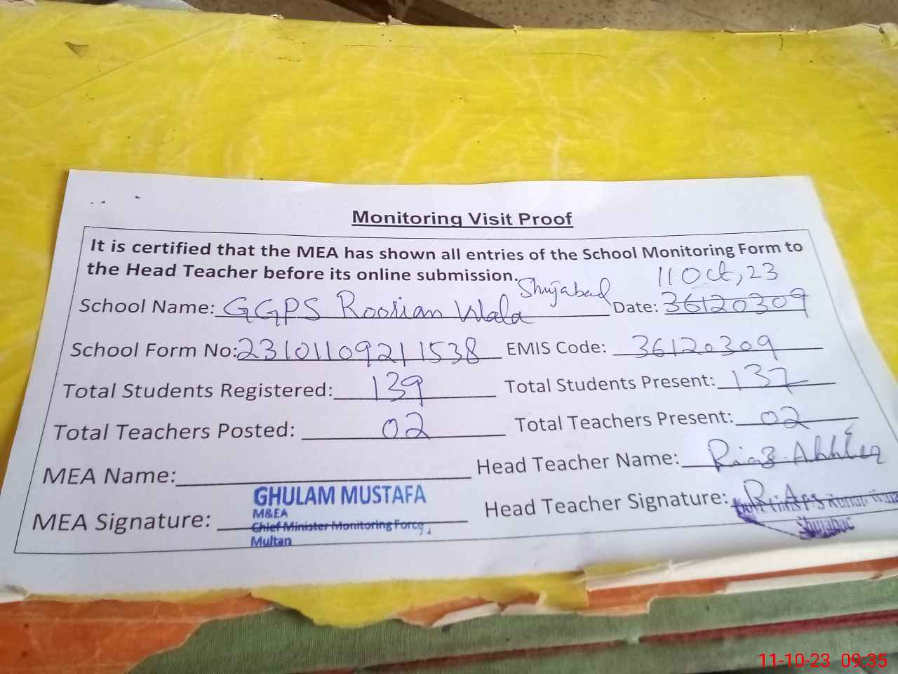 | Monitoring Date: 11-10-2023 | Start Time: 11-10-2023 08:57 AM | End Time: 11-10-2023 09:39 AM | Name of MEA: Gh**** Mu**** | |