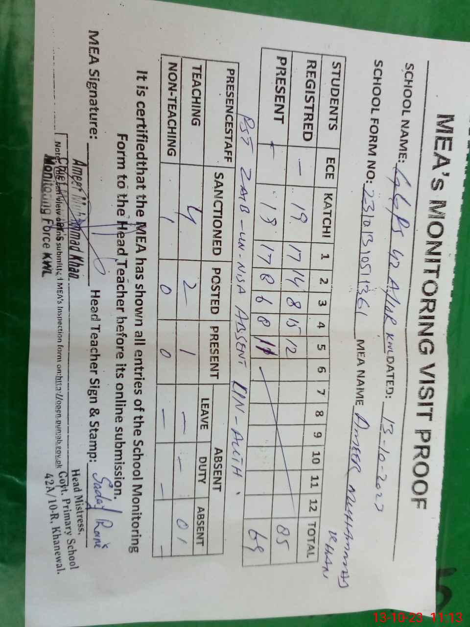 | EMIS Code: 36420475 | Name of School: GGPS 42-A/10-R, KACHA KHUH | |||