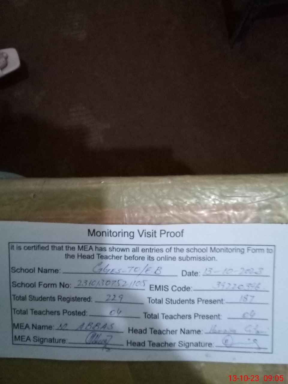 | Attendance Register | Head Teacher | MEA with School | Visit Proof |