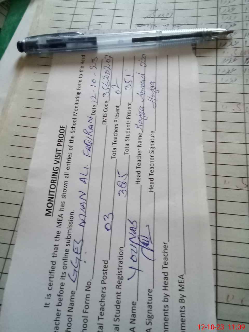 | Attendance Register | Head Teacher | MEA with School | Visit Proof |
