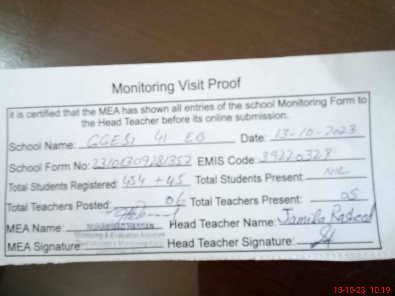 | Attendance Register | Head Teacher | MEA with School | Visit Proof |