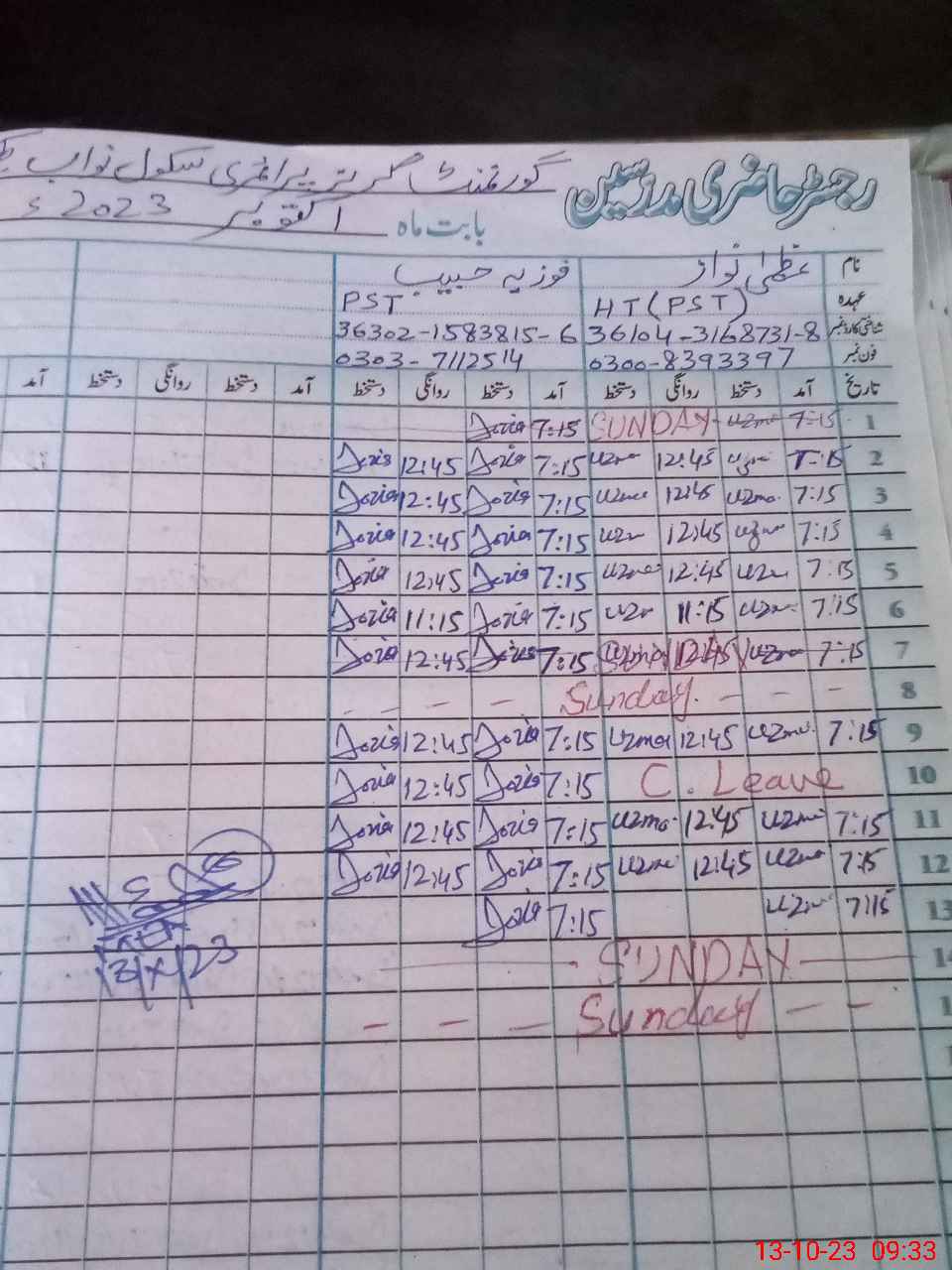 | Name: Uz**** Na**** Designation: (School Headmaster's/Headmistress's) PST Phone/Cell Number: 03**** |