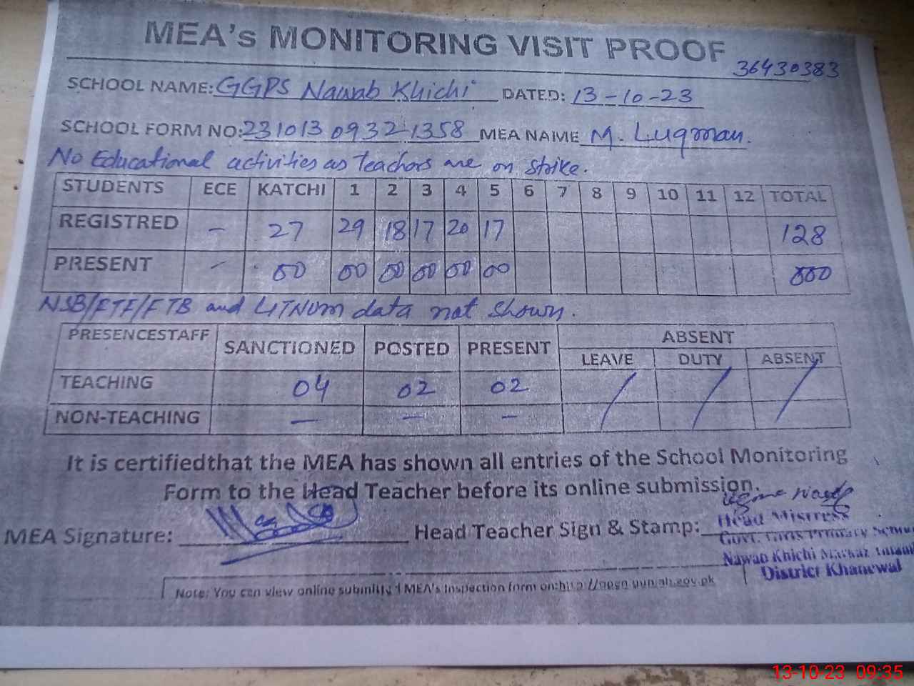 | Attendance Register | Head Teacher | MEA with School | Visit Proof |