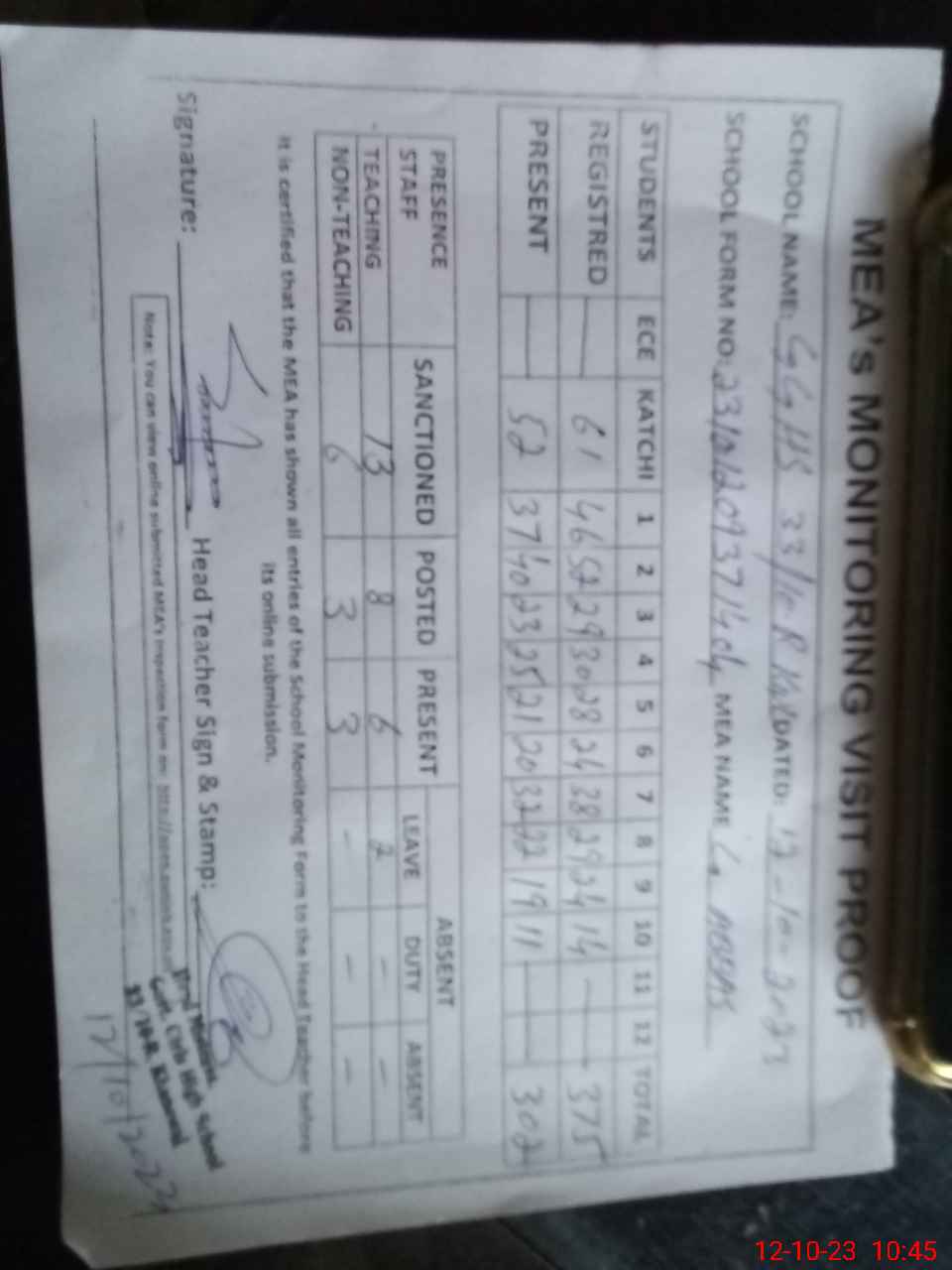 | Attendance Register | Head Teacher | MEA with School | Visit Proof |