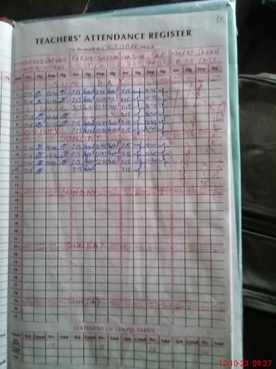 | No. of Students Present - Male | 0 | 0 | 7 | 7 | 9 | 0 | 0 | 0 | 0 | 0 | 0 | 0 | 0 | 23 | ||