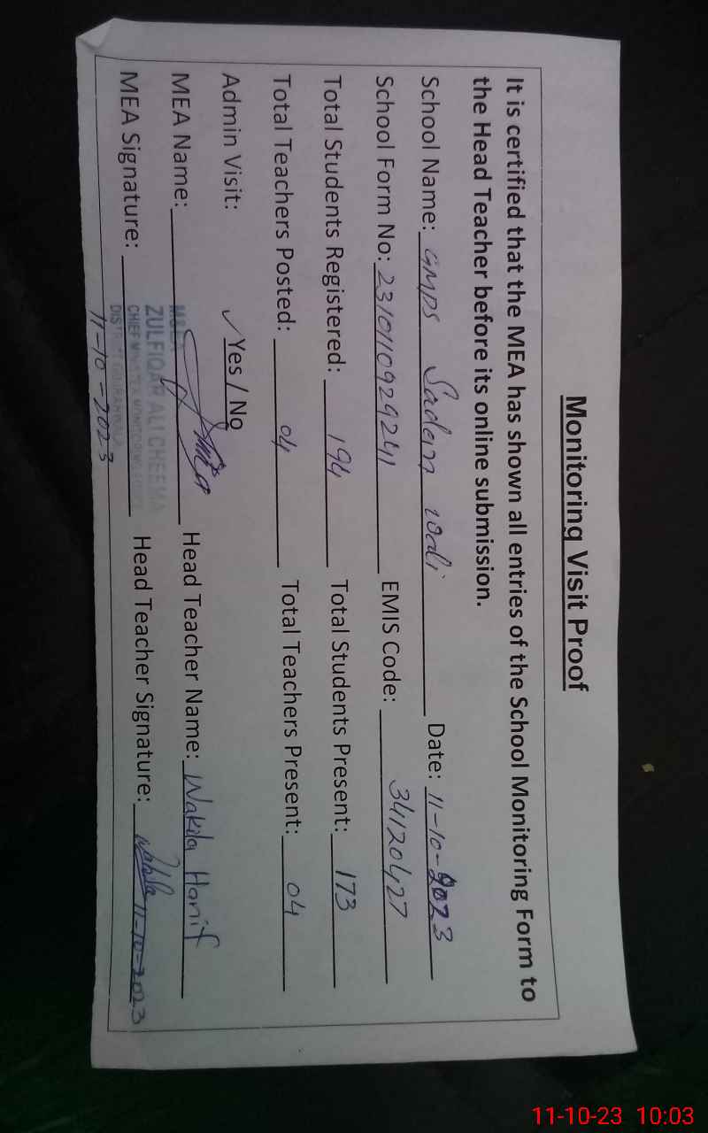 | EMIS Code: 34120427 | Name of School: GMPS SADAN WALI | |||