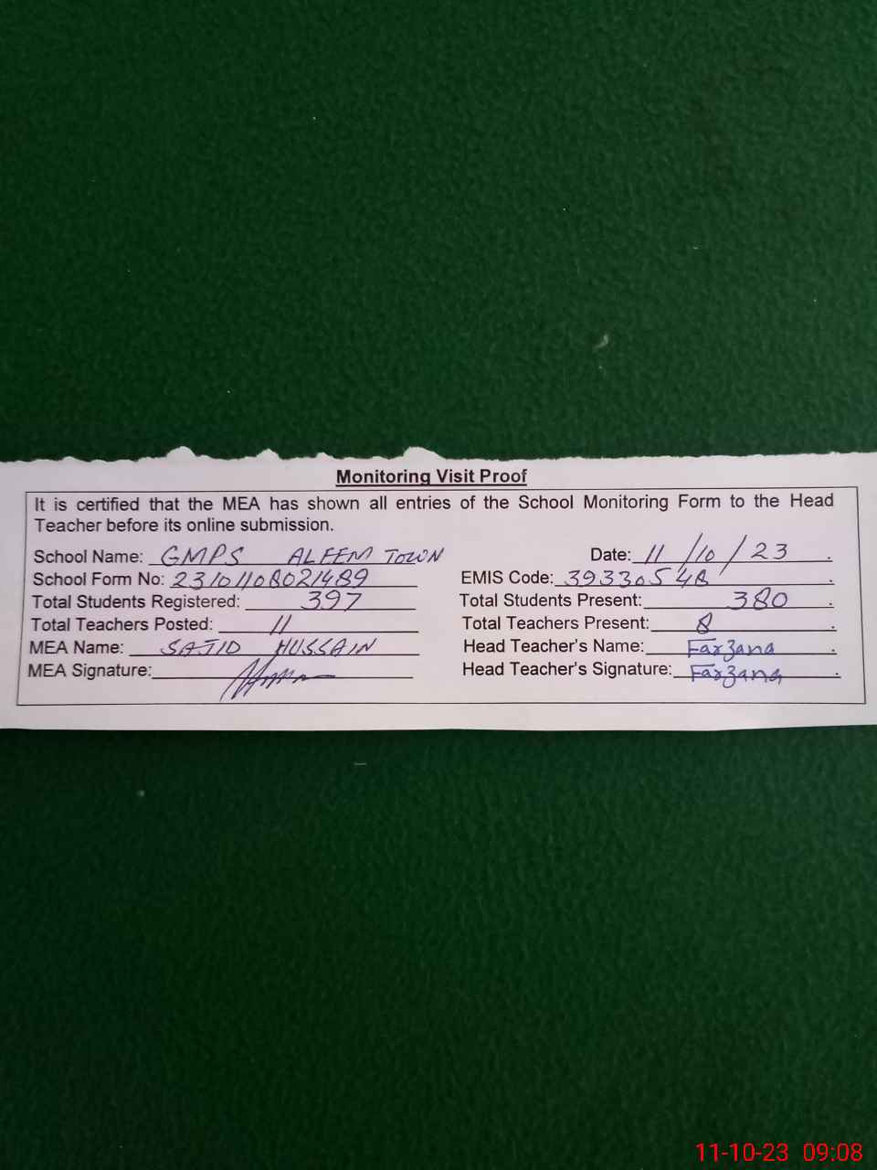 | Attendance Register | Head Teacher | MEA with School | Visit Proof |