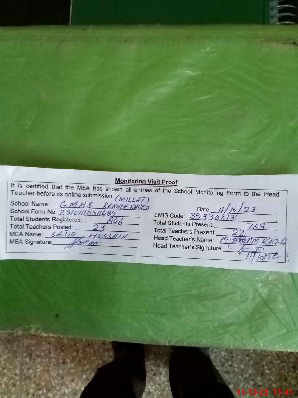 | Attendance Register | Head Teacher | MEA with School | Visit Proof |