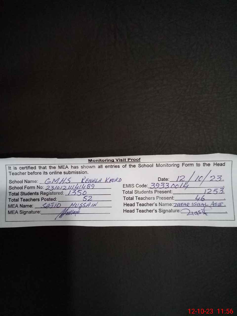 | Monitoring Date: 12-10-2023 | Start Time: 12-10-2023 11:14 AM | End Time: 12-10-2023 11:56 AM | Name of MEA: SA**** HU**** (R**** | |