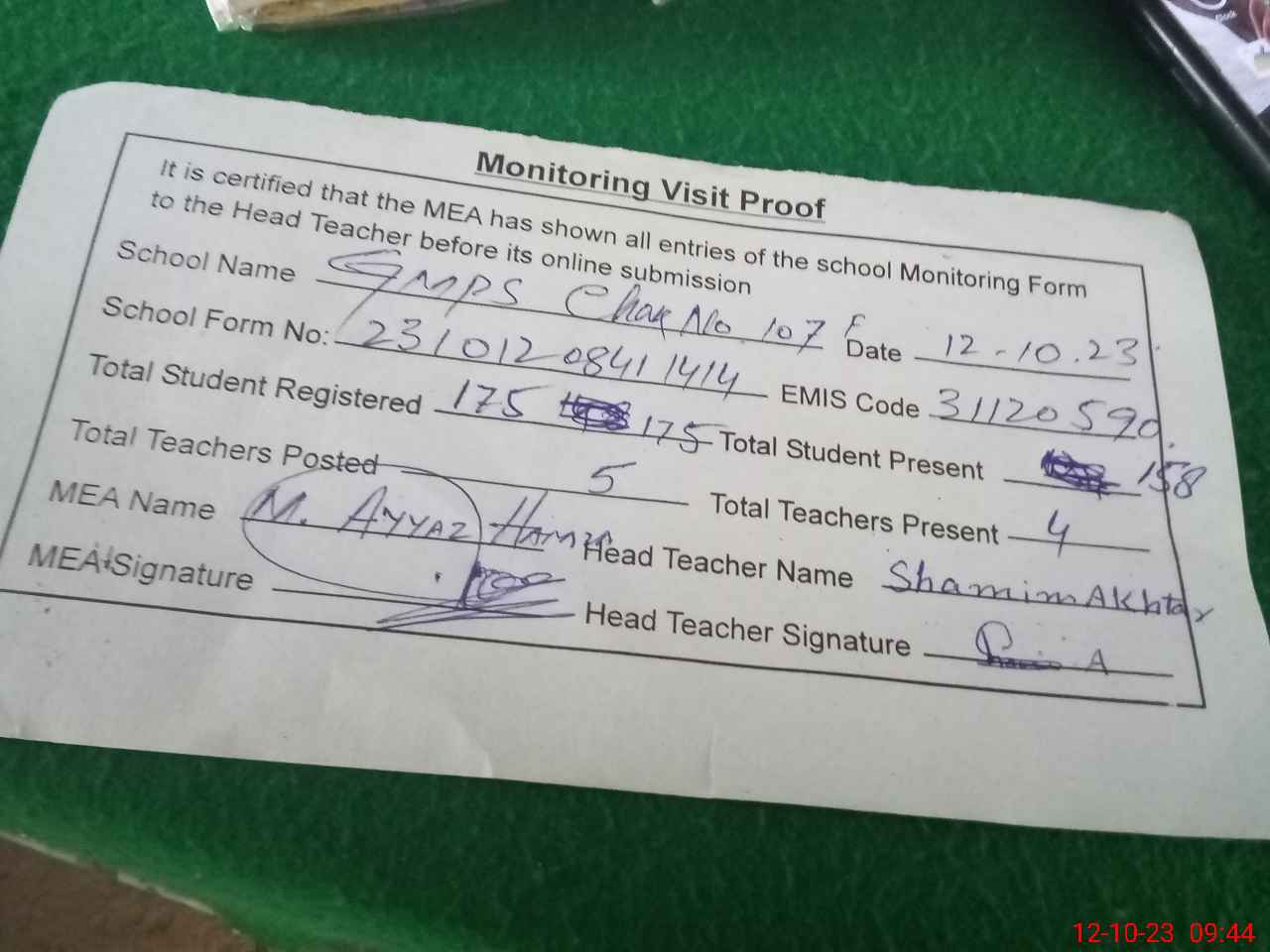 | Attendance Register | Head Teacher | MEA with School | Visit Proof |