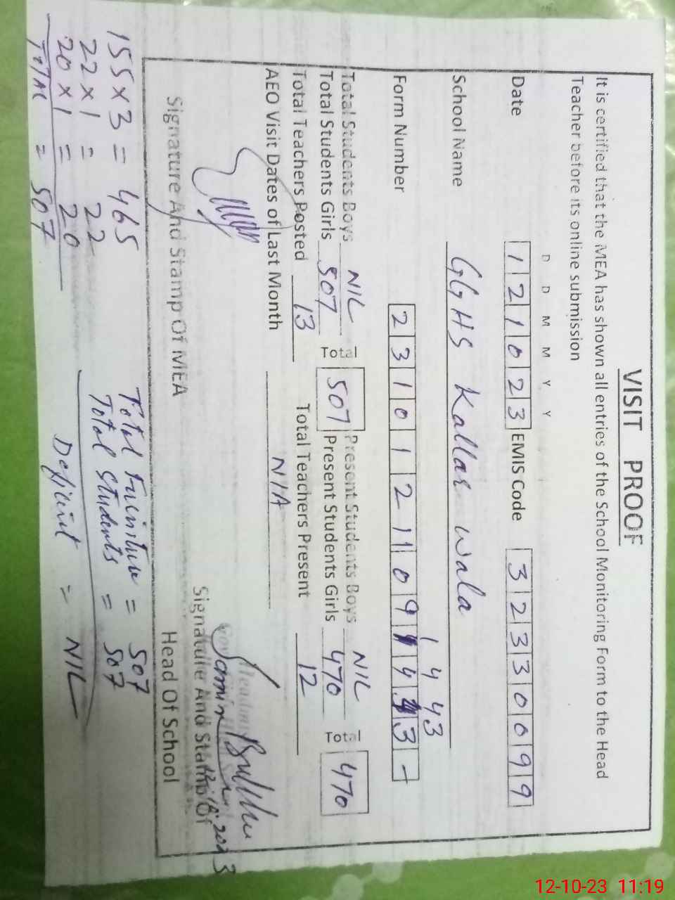 | Attendance Register | Head Teacher | MEA with School | Visit Proof |