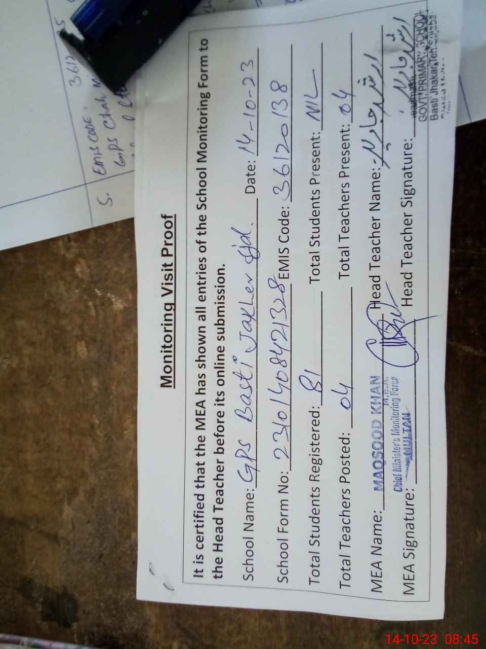 | Attendance Register | Head Teacher | MEA with School | Visit Proof |