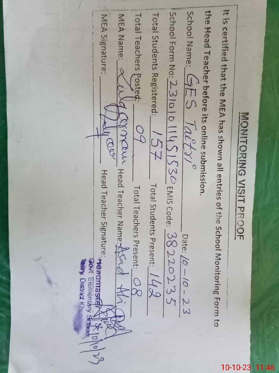 | Attendance Register | Head Teacher | MEA with School | Visit Proof |