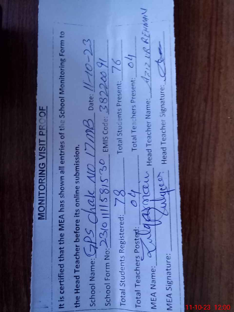 | Attendance Register | Head Teacher | MEA with School | Visit Proof |