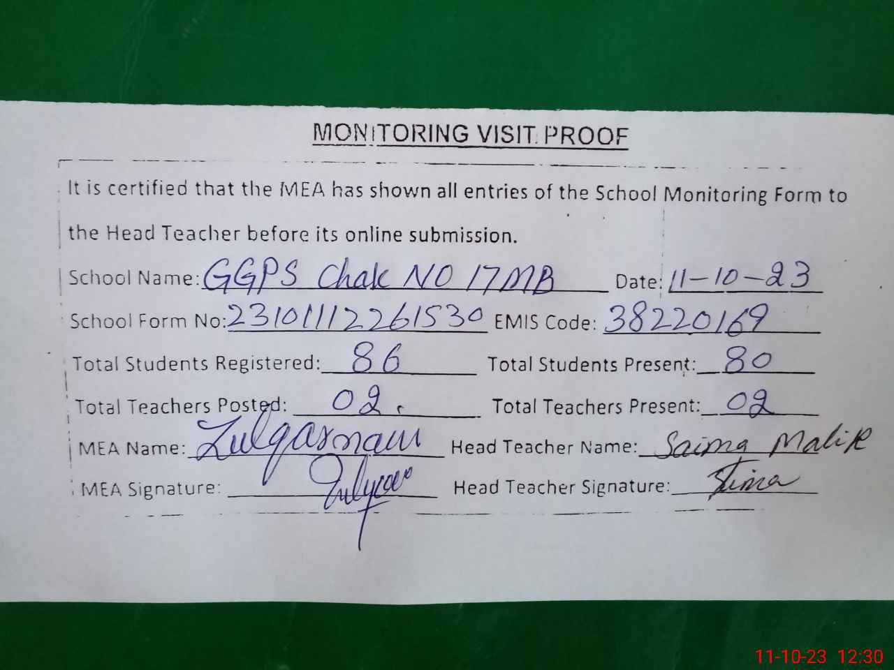 | Attendance Register | Head Teacher | MEA with School | Visit Proof |