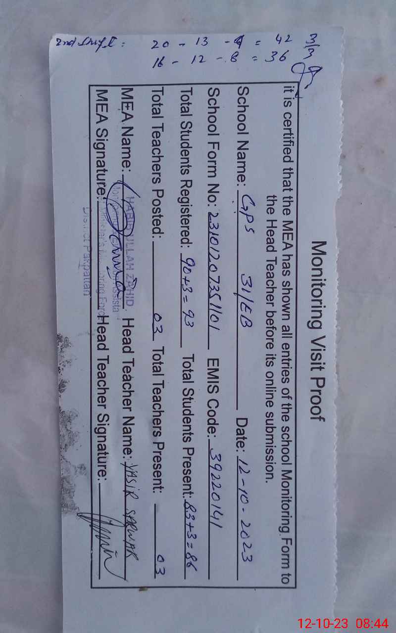 | Attendance Register | Head Teacher | MEA with School | Visit Proof |