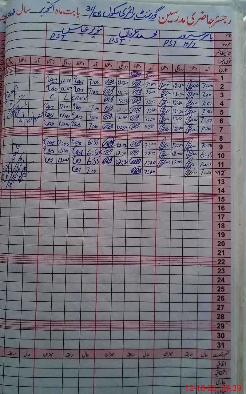 | CNIC | Full Name | Designation | R/C | Absence During Last Calender Month |